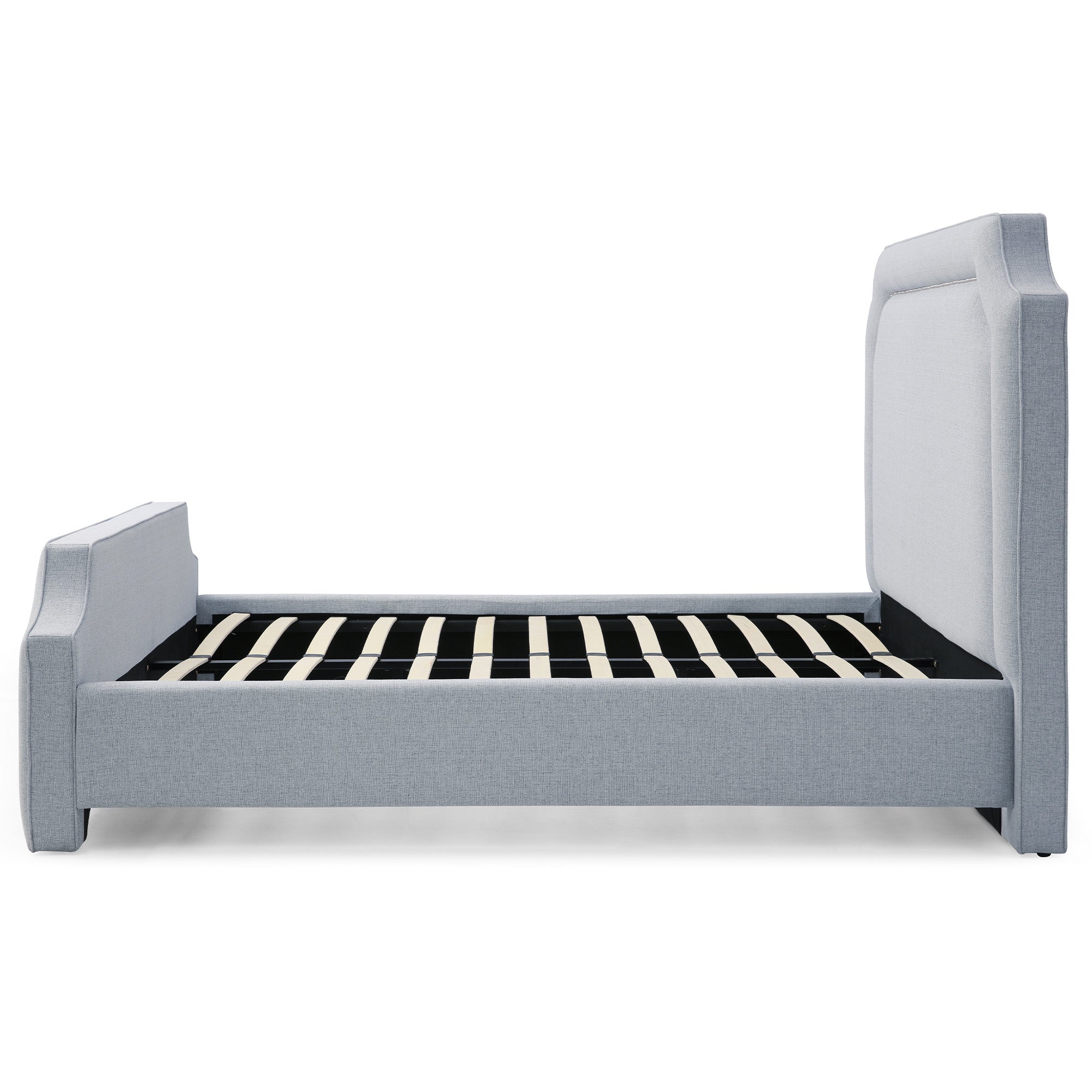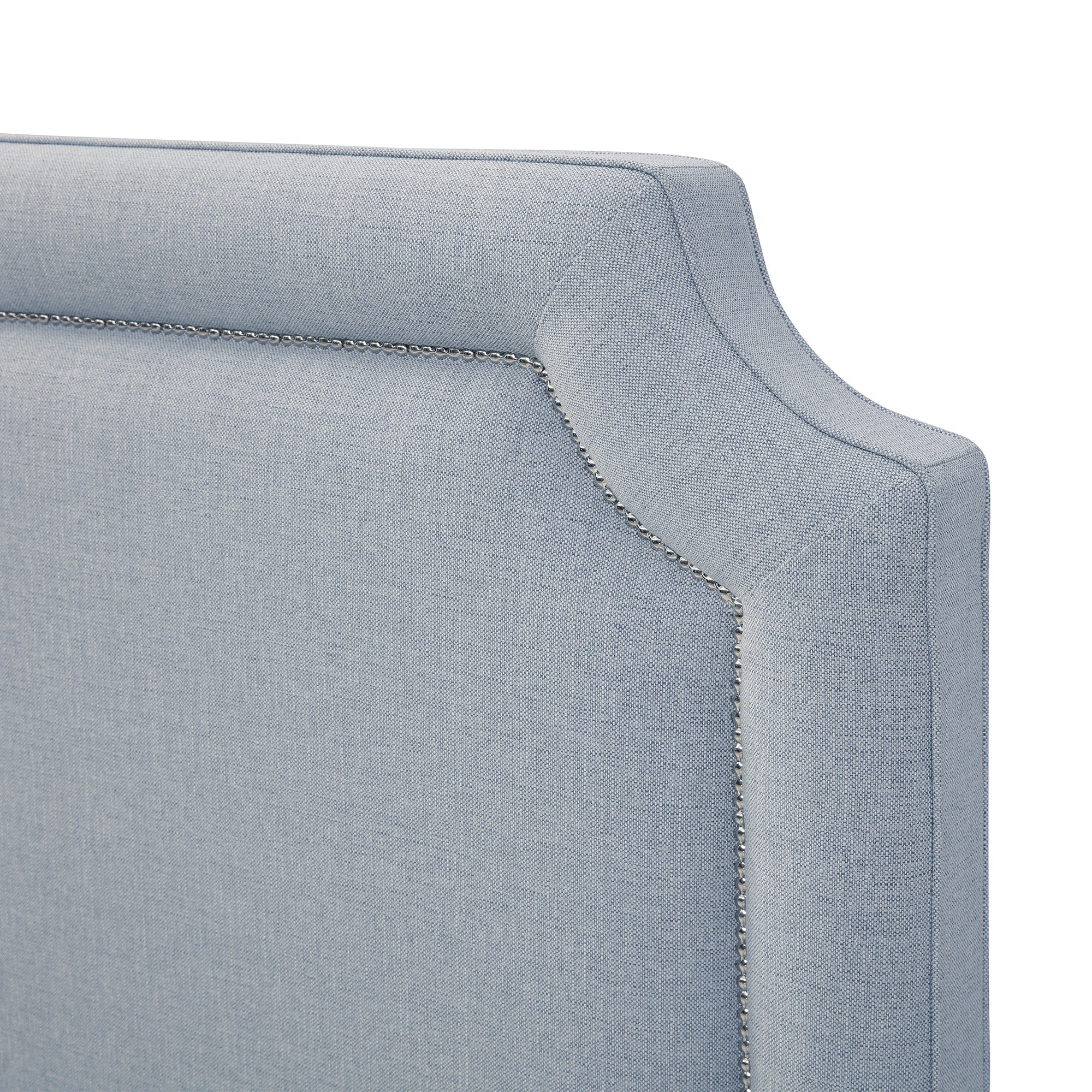 - Elegant, scooped headboard with tailored upholstery.